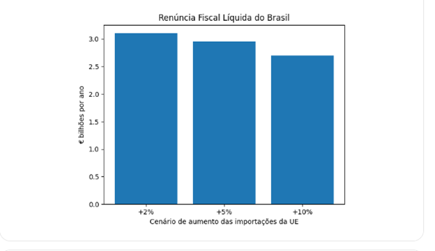 A análise quantitativa já desenvolvida evidencia que o custo fiscal direto do acordo para o Brasil concentra-se na redução do Imposto de Importação (II) incidente sobre produtos originários da União Europeia. As estimativas indicam uma renúncia bruta anual próxima de € 3,2 bilhões, que, quando ajustada pelos efeitos dinâmicos de arrecadação de PIS e COFINS-Importação, resulta em uma renúncia líquida entre € 2,7 e € 3,1 bilhões anuais, conforme os cenários de aumento de importações considerados.