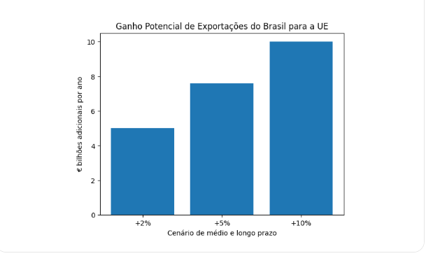 - Efeito-volume de médio prazo, estimado em aumentos potenciais entre € 7 bilhões e € 10 bilhões anuais nas exportações brasileiras para a UE, conforme cenários conservadores e moderados já apresentados;