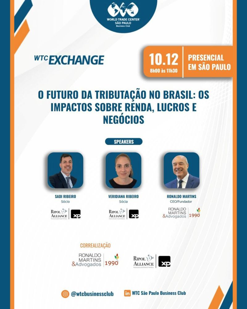O WTC Exchange realiza no próximo dia 10 de dezembro, das 8h às 11h30, um encontro presencial dedicado a discutir o futuro da tributação no Brasil e seus efeitos diretos sobre rendas, lucros e estratégias empresariais. Em um ambiente econômico marcado por transformações constantes, compreender o papel da tributação no planejamento financeiro e na competitividade tornou-se indispensável para empresas e investidores.